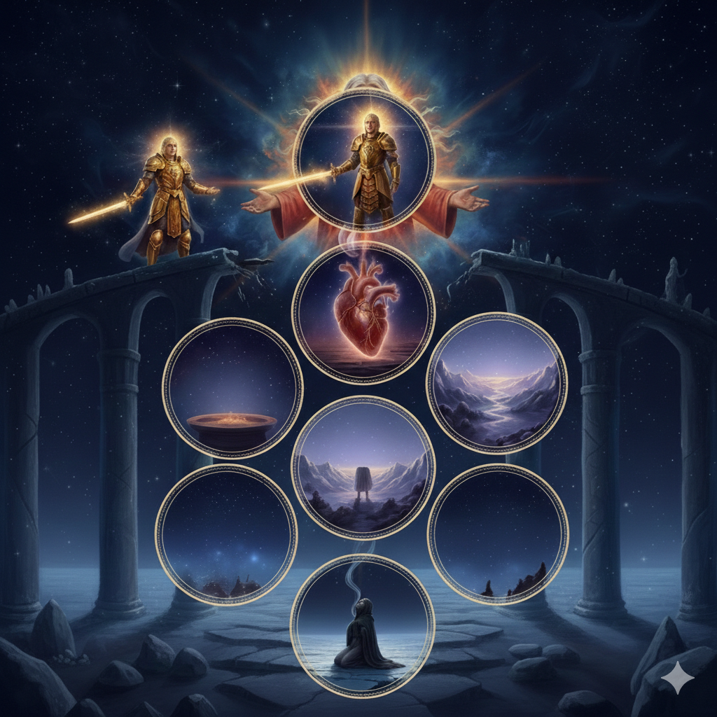 El Martinismo es una Orden de Caballería cuyo estandarte está tejido con la luz del corazón. Su alta misión reside en la Reintegración: la labor sagrada de conducir al Iniciado hacia la reconciliación con su espíritu esencial. En este fuego interno se forja el guerrero espiritual, un combatiente que libra su batalla con las armas del discernimiento y una voluntad fundida en el divino propósito.